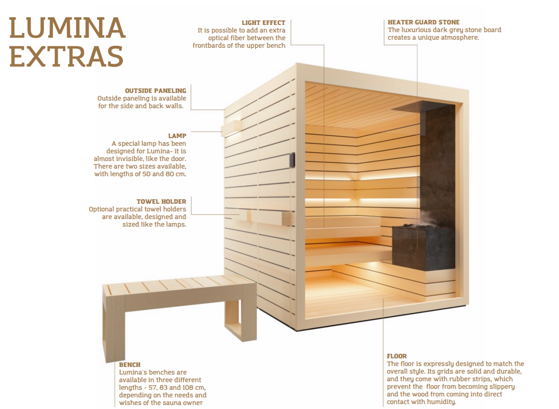Luminas bänkar finns i tre olika längder - 57, 83 och 108 cm, beroende på bastuägarens behov och önskemål.