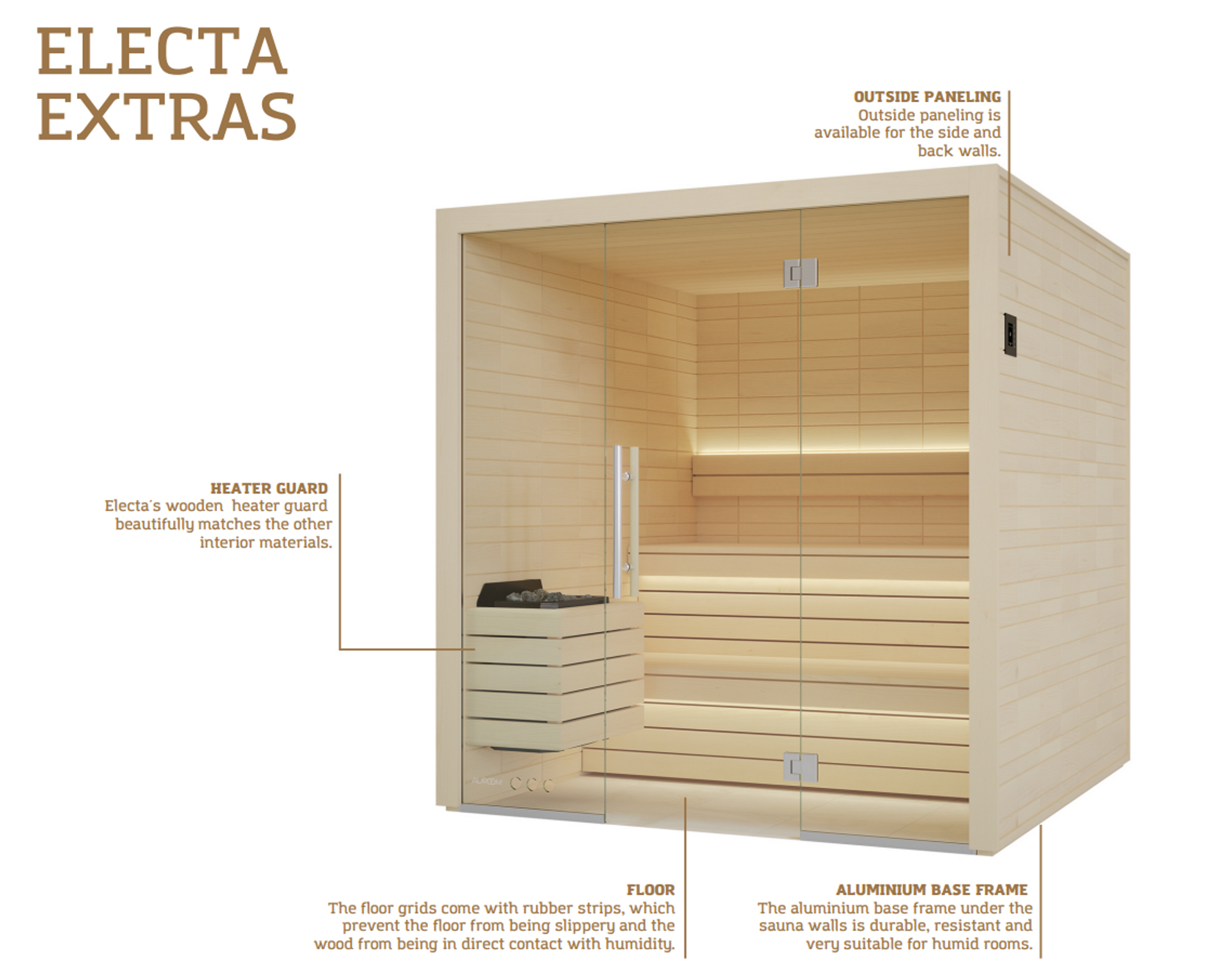 Electa är inte ett slumpmässigt namn utan sammanfattar de känslor som kommer upp i en person som slappnar av i denna exklusiva bastu. Det är en plats där man lätt kan känna sig som om man har blivit vald till något viktigt i livet.