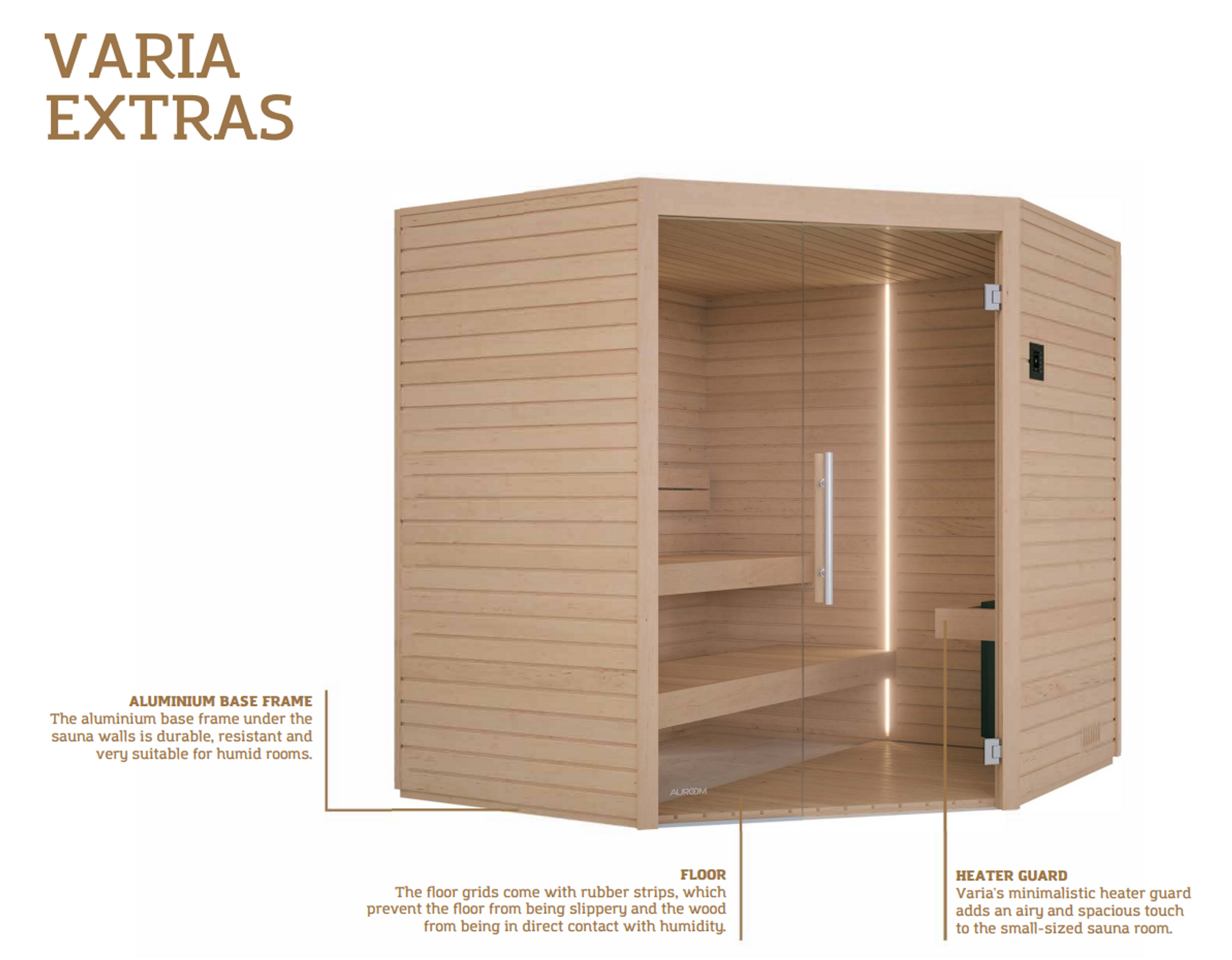 Namnet Varia står för allt som förändrar vardagen. En vanlig bastu med några förändrade detaljer för att ge extra friskhet och motverka rutinen.
