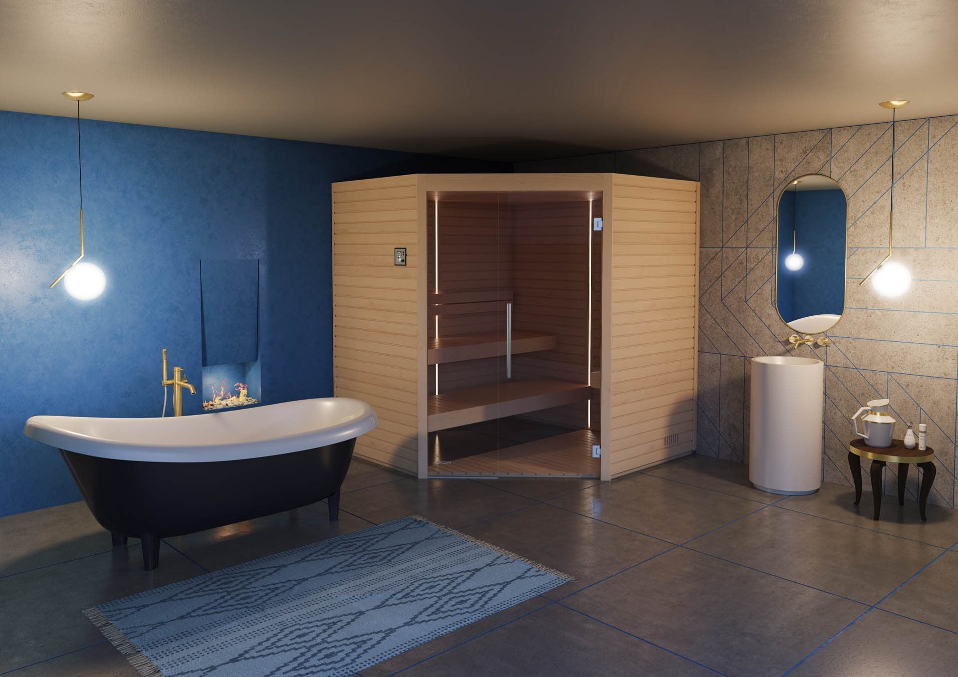 Varia är en flexibel och praktisk hörnpassningsmodell. Den här bastun har ett mycket kreativt, vackert ljusschema och en omsorgsfullt utformad interiör, vilket gör den till en idealisk plats för dig att föryngra dig. De korsvis placerade bänkbrädorna och det minimalistiska bastuaggregatskyddet ger en luftig och rymlig touch till det lilla basturummet.
