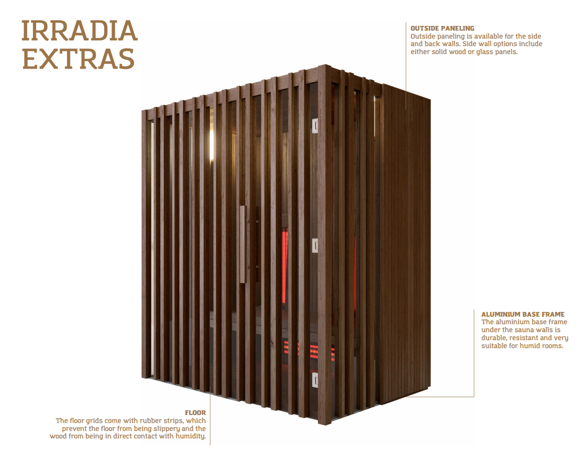 Å ena sidan återspeglar namnet Irradias huvudsakliga egenskap - infraröda strålar. Å andra sidan antyder namnet den modiga och strålande designen. Den infraröda tekniken gör att du kan andas lättare när den försiktigt värmer upp dig inifrån och ut samtidigt som den håller luften i kupén behagligt mild.